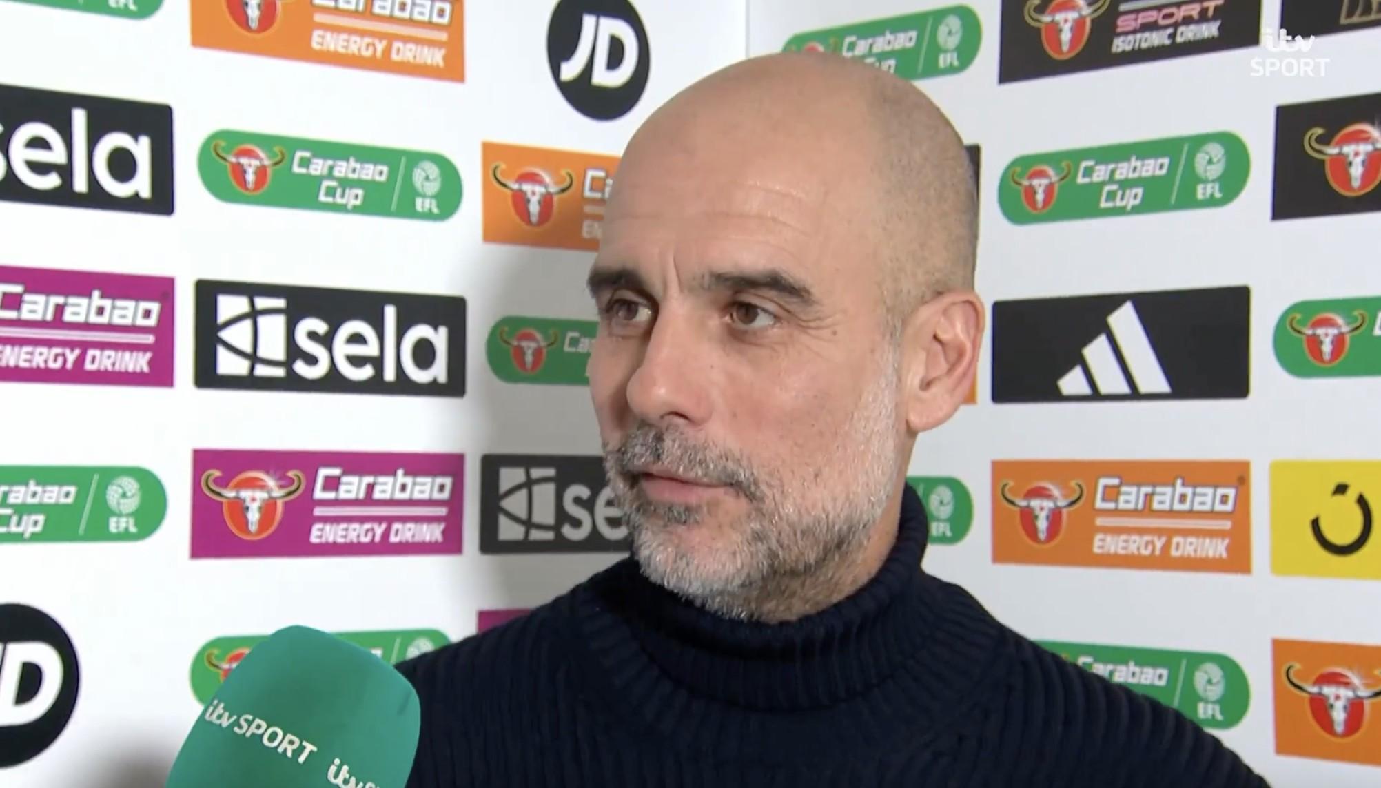 英联杯半决赛首回合,曼城客场对阵纽卡,赛前,曼城主帅瓜迪奥拉接受了ITV的采访。
